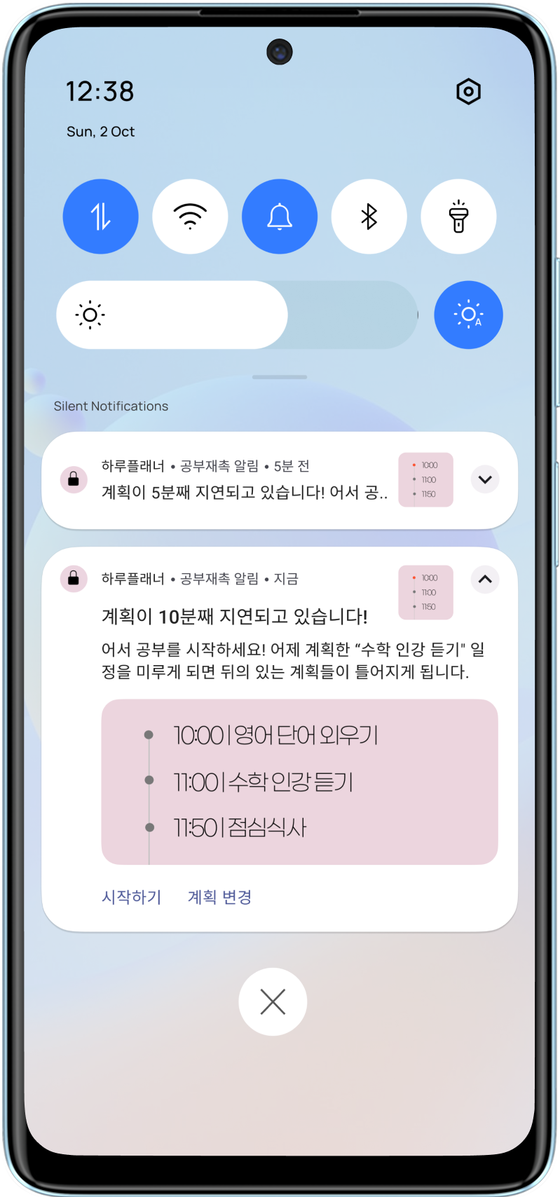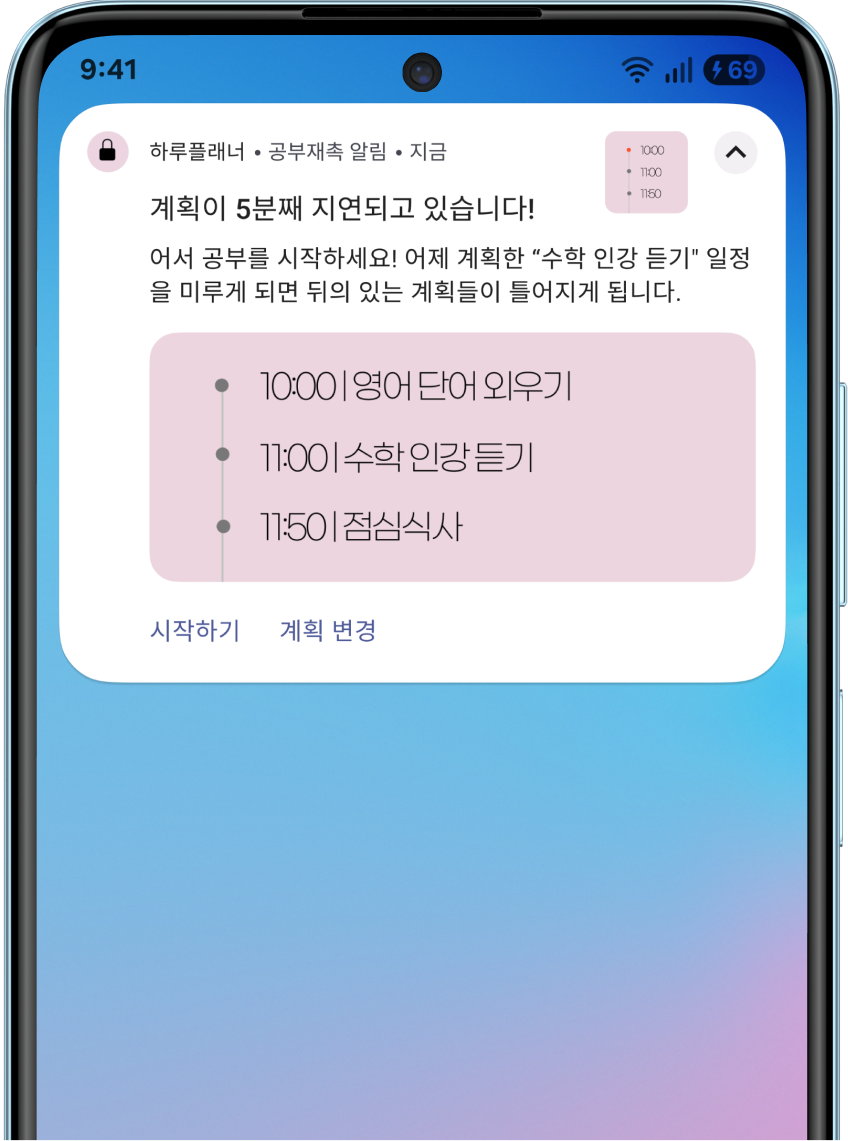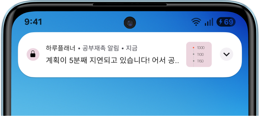 만약 당신이 계획했던 일을 시작하지 않고 계속 딴짓을 하는데 시간을 쏟는다면, 하루플래너는 이를 가만히 놔두지 않을 것입니다. 당신이 원래 계획했던 일을 시작할 때까지 5분 단위로 계속해서 알림을 보내드립니다.
